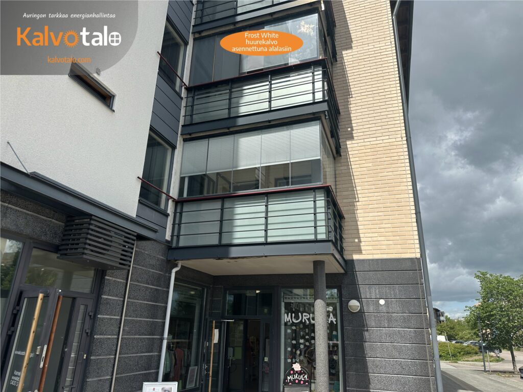 Alla olevassa kuvassa parvekkeen alalasituksen näkösuoja on toteutettu Frost White kalvolla joka tekee pinnasta maitolasimaisen. Kalvosta ei näe suoraan läpi kumpaankaan suuntaan mutta se päästää runsaasti valoa läpi. Tällöin se ei pimennä tilaa.