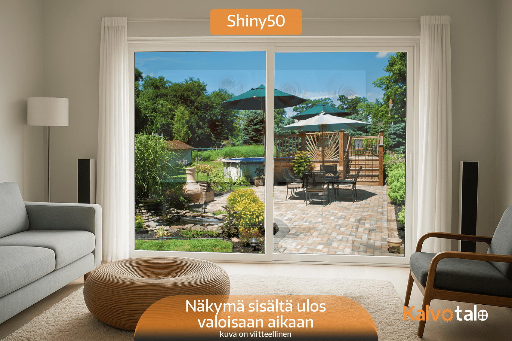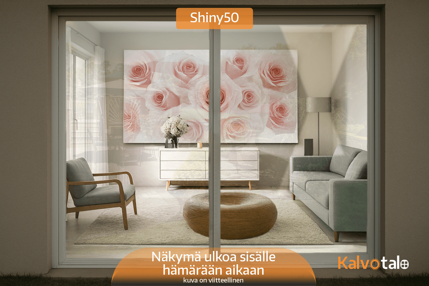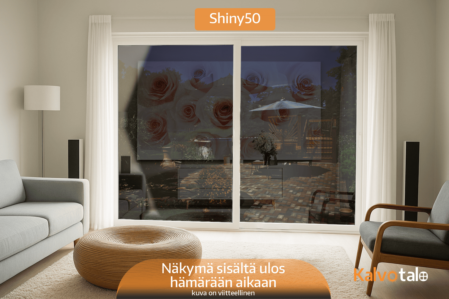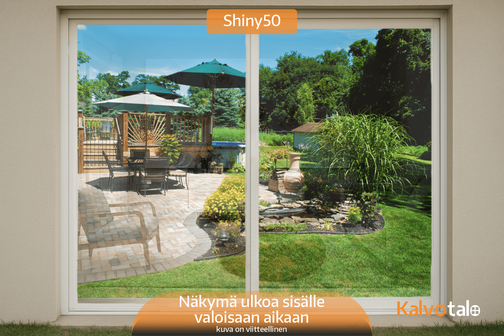 Auringonsuojakalvo Shiny50 on myydyin kalvomme omakotitalojen sisäasennuksiin ja se on vaalein vaihtoehto Shiny-kalvosarjasta. Kalvo lisää ikkunan peilaavuutta vain hieman ja on sisältä katsottuna hyvin huomaamaton, mutta se torjuu silti auringon lämpösäteilystä jopa 50 %. Kalvo on suunniteltu asennettavaksi avattavien ikkunoiden uloimman lasin sisäpintaan. Kiinteisiin tai avattaviin elementti-ikkunoihin vastaava auringonsuojakalvo on Shiny50 exterior, joka asennetaan ikkunan ulkopintaan. Kalvo torjuu auringon lämpösäteilyn lisäksi myös jonkin verran heijastuksia, eli esimerkiksi television katso olohuoneessa on helpompaa, kun kalvo kääntää osan auringon heijastuksesta pois ja television kuva säilyy kirkkaana.